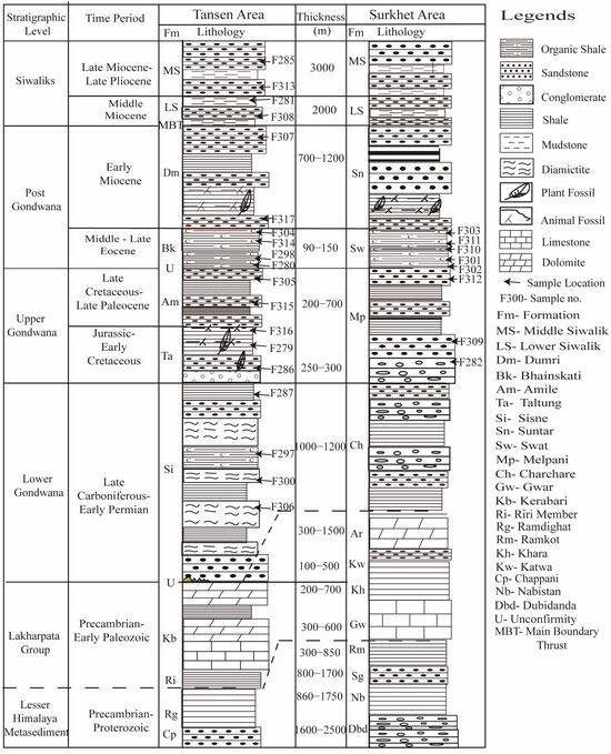 Columnar section of the Tansen area and Surkhet area with the sample location modified after Sakai [19] and Kayastha [40].