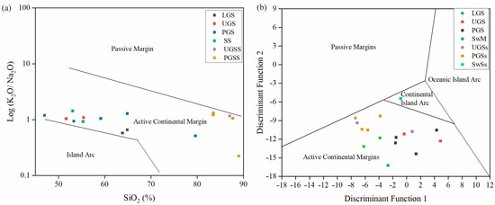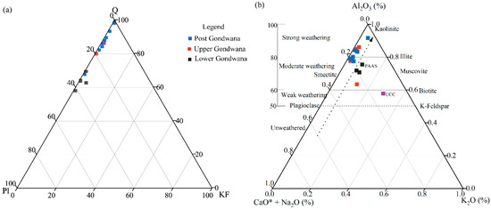 (a) Chemical classification of the Gondwana and post-Gondwana shale and sandstone using major oxide data (log (Fe2O3/K2O) vs. log (SiO2/Al2O3)) after Herron [54] and (b) quartz richness analysis Na2O–K2O diagram after Crook [55].