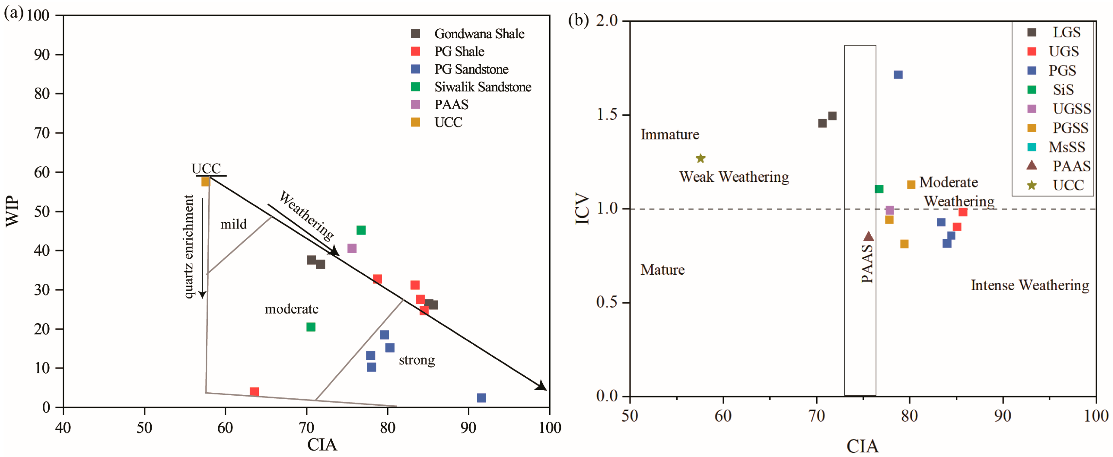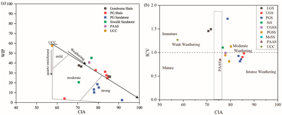 (a) WIP versus CIA and (b) CIA versus ICV indicating maturity and intensity of weathering (after Cox, 1995) [69] (WIP: Weathering index of plagioclase; CIA: Chemical Index of weathering; ICV: Index of Compositional Variability).