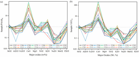 (a) Distribution patterns of major oxides in samples normalized to PAAS values, (b) distribution patterns of major oxides in samples normalized to UCC values (normalizing values of UCC after Taylor and McLennan, 1985) [48] from the Tansen and Surkhet Basin.