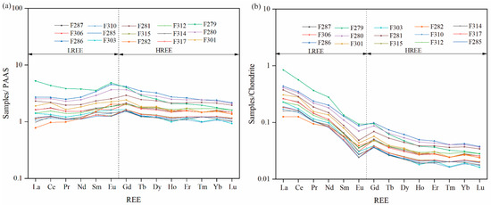 (a) Distribution patterns of rare-earth elements in shales and sandstone samples from the Tansen and Surkhet Basin normalized to post-Archean Australian Shale (PAAS) values (normalizing values of PAAS after Condie, 1993) [71], (b) normalized to chondrite values (Chondrite normalization values from (Taylor and McLennan, 1985) [48].