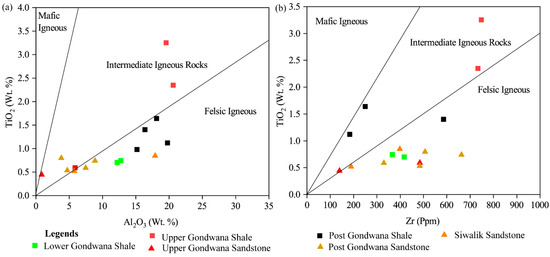The high SiO2 content in post-Gondwana shale and sandstone and significant Fe2O3 and MnO concentrations indicate derivation from the continental crust and possible tectonic uplift and erosion. Na2O concentrations above 1% are likely due to plagioclase breakdown in the source region. K2O/Na2O ratios are lower (<5) in Gondwana and maximum (>10) in the post-Gondwana. The high K2O/Na2O ratios (3.76 to 19.70) suggest derivation from felsic rocks, likely granitic or gneissic, as these ratios are characteristic of source areas rich in K-feldspar and mica. The Al2O3/(Al2O3 + Fe2O3) ratio of the shale samples ranges from 0.64 to 0.95, with an average of 0.88, indicating sedimentation in a continental margin. The Al2O3/TiO2 ratio serves as a provenance index, with values spanning from 8 to 21 wt.%. The range suggests a predominant felsic to intermediate source (Figure 12a), consistent with sediments from a continental arc or active continental margin [72]. The tectonic environment of sedimentary rocks significantly impacts their clastic components. Clastic rocks contain various geochemical components that may have come from different tectonic settings [62]. Plotting TiO2 and Zr ratios of the sandstone and shale in the Lower Gondwana confirms the felsic source. In contrast, the Upper to post-Gondwana shale supports felsic to intermediate igneous rock as the source of clastic input (Figure 12b).