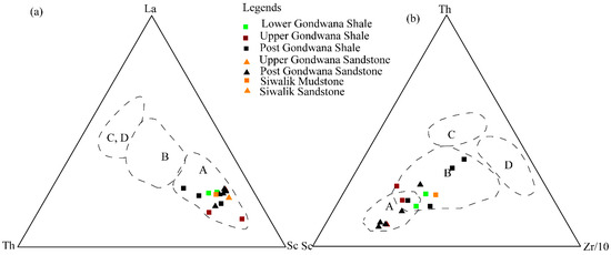 The interplay between tectonism and depositional systems significantly influences the geochemical compositions of sediments [6]. Active tectonism with steep slopes enables rapid sediment discharge, while tectonic quiescence with gentler slopes allows longer residence times and more weathering during transport. The REE abundances in source rocks and the weathering conditions in source areas are the major factors controlling the REE in the accumulating sediments. Hence, REE in clastic sedimentary rocks is widely used as the primary indicator to identify the provenance [18]. The La-Th-Sc discriminant diagram distinguishes between continental and oceanic island arcs, while the Th-Sc-Zr/10 diagram differentiates active from passive continental margins [18]. Plotting all shale and sandstone samples from the Gondwana and the post-Gondwana units on a La-Th-Sc (Figure 13a) discrimination ternary plot reveals that the sandstone source areas predominantly derive from Oceanic Island Arc (OIA) and Th-Sc-Zr/10 (Figure 13b) indicate mixed source sandstones mainly from Oceanic Island Arc and shale from Continental Island Arc.