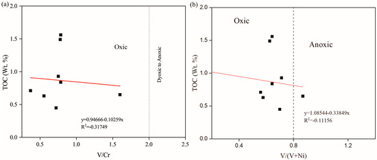 Cross-plots of (a) TOC against redox condition proxies of trace element (V/Cr) ratio and (b) TOC versus V/(V + Ni) indicating negative correlation coefficient (after Hatch and Leventhal [17]).