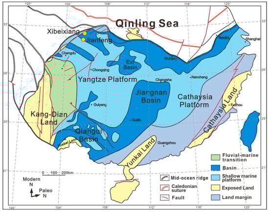 Paleogeographic map of South China during the deposition period of the Dalong Formation, showing the location of the Xibeixiang and Jianfeng sections (modified from [11]).
