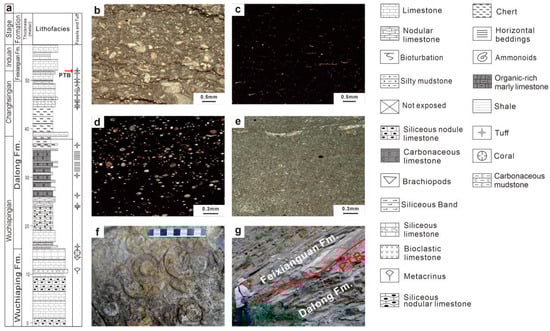 (a) The lithological column of the Xibeixiang section. Photomicrographs under plane-polarized light show (b) ampelitic limestone in the middle part of the Dalong Formation, (c) bedded chert bearing large numbers of radiolarians in the upper part of the Dalong Formation, and (e) lime mudstone in the uppermost Dalong Formation. (d) The limestone lens of the upper part of the Dalong Formation. (f) Ammonite fossils in the upper part of the Dalong Formation. (g) The photomacrograph of the Permian-Triassic boundary (PTB). A standing person for scale (1.65 m).