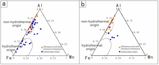 Al-Fe-Mn diagram of the Dalong Formation in the (a) Xibeixiang and (b) Jianfeng sections (after reference [15]).
