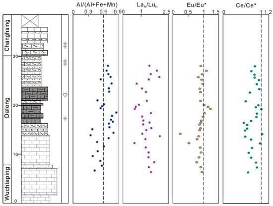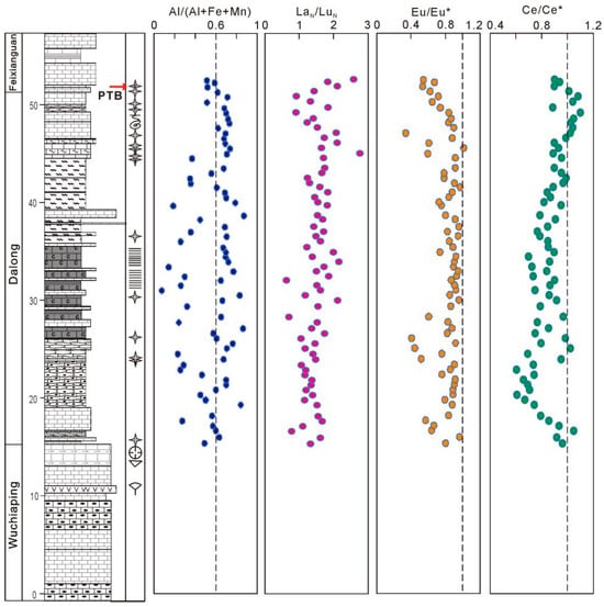 Chemostratigraphic profiles for the hydrothermal proxies of Dalong Formation in the Xibeixiang section. See Figure 2 for legends. The dotted line represents the boundary of the condition, as explained in detail in the text.