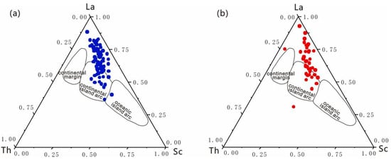 La-Th-Sc diagram of Dalong cherts at (a) the Xibeixiang section and (b) the Jianfeng section (base map after reference [29]).