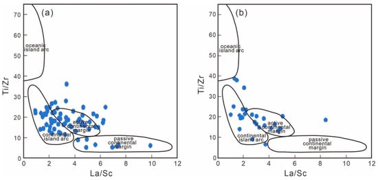 Cross-plot between La/Sc and Ti/Zr of Dalong cherts at (a) the Xibeixiang section and (b) the Jianfeng section (base map after reference [29]).
