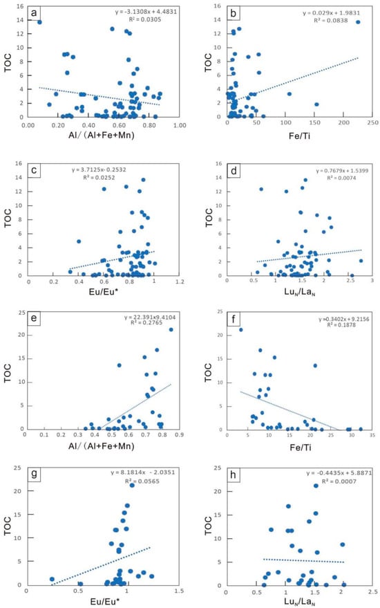 Cross-plot between TOC and indicators of hydrothermal activities in (a–d) the Xibeixiang section and (e–h) the Jianfeng section.