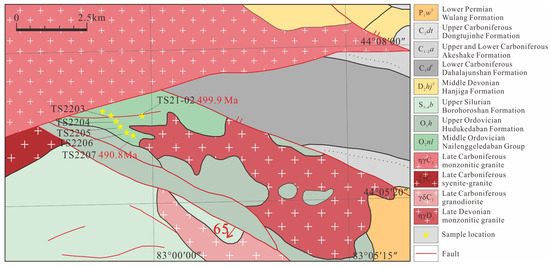 The Paleozoic magmatism of the northern YB has been extensively studied by previous researchers. Hu et al. (2008) first reported the Early Paleozoic plagioclase amphibolite of the Wenquan Group in the northern YB, which was formed in the Late Ordovician (455.1 ± 2.7 Ma and 451.4 ± 5.4 Ma) and had geochemical features similar to island arc rocks. More Ordovician magmatic rocks were found there within the Wenquan area, and it is thought that these magmatic rocks are the result of the southward subduction of the North Tianshan Ocean [9,12,14,15,16,17,18]. Contemporaneous volcanic activity also records this tectonic event [10,11,13,19,20]. However, the exact timing of the transition of the northern YB from a passive to an active continental margin remains unknown.