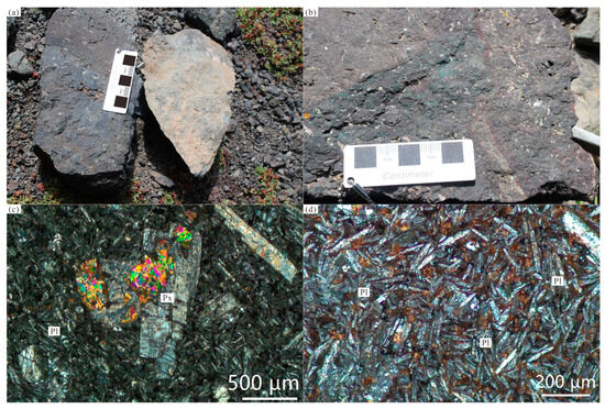 (a) TS21-02, (b) TS2207 field photos, and (c) TS21-02, (d) TS2207 microscope photos of basalts in the Nailenggeledaban area. Pl: plagioclase, Px: pyroxene.