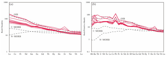 (a) Chondrite-normalized REE patterns and (b) space primitive mantle-normalized trace element (normalization values are from Sun et al., 1989 [48]).