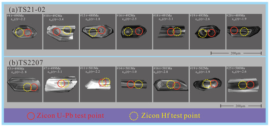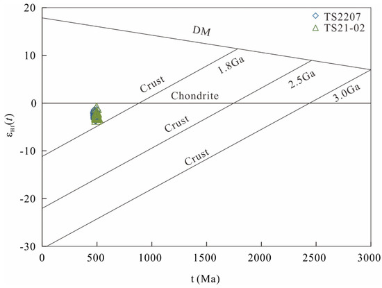 A total of 12 zircon crystals from TS21-02 and 14 zircon crystals from TS2207 were selected for in situ Lu-Hf isotope analysis. The results are presented in Table S3. The 176Lu/177Hf ratios of all zircon crystals range from 0.000700 to 0.002598, with an average value of 0.001306, indicating a low radiogenic Hf content in the selected zircon crystals for this study. The measured 176Hf/177Hf ratio essentially reflects the composition of Hf isotopes at the moment of formation [49].