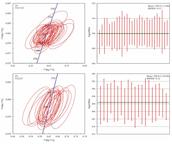 Thirty zircon crystals were analyzed from the sample TS21-02. Their Th and U contents range from 152 to 859 ppm and 262 to 1860 ppm, respectively, with Th/U ratios varying between 0.15 and 1.38, which suggests an igneous origin. Thirty concordant analyses were obtained from thirty zircon grains. The thirty zircon crystals have a U-Pb age of 490–514 Ma, with a weighted average of 500 Ma (Figure 6a).