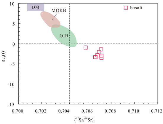 (87Sr/86Sr)i-εNd(t) plot for the basalts in the Nailenggeledaban area (modified after Zimmer et al., 1995 [50]). DM: depleted mantle, MORB: Mid-Ocean Ridge Basalt, OIB: Ocean Island Basalt.