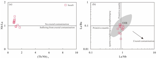 The primary mantle-derived magma typically undergoes contamination and metasomatism with crustal materials during the ascent process. Additionally, fractional crystallization can also induce changes in the elemental composition and isotopic ratios of the primary magma. Crustal materials generally exhibit relatively low Nb/La, La/Ba, and Nb/Ba values [53,54]. The high primitive mantle-normalized Th/Nb ratios (>>1; [55]) and the low Nb/La ratios [56] are features of the primary magma undergoing crustal contamination. The studied basalt samples exhibit low La/Ba values ranging from 0.03 to 0.11, with a mean value of 0.08; (Th/Nb)N values ranging from 0.83 to 1.71, with a mean value of 1.03; and high Nb/La values ranging from 0.93 to 1.40, with a mean value of 1.13. In the Nb/La-(Th/Nb)N diagrams (Figure 9a) and La/Ba-La/Nb diagrams (Figure 9b), the majority of basalts are classified as uncontaminated volcanic rocks, indicating very limited crustal contamination during the magma ascent process.