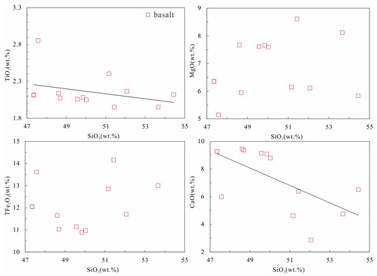 Twelve basalt samples were analyzed for whole-rock geochemical features, and the analytical results are presented in Table S1. The LOI values of the basalt samples tested in this study are all above 2.80%, indicating a certain degree of alteration. When utilizing main element oxide analysis data for rock type identification, environmental discrimination, and discussions on the genesis of volcanic rocks, the LOI is initially subtracted to obtain the remaining main element oxide data, which are then recalculated to 100% [45].