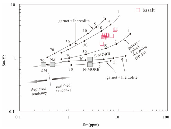 Sm/Yb-Sm diagram of basalt in the Nailenggeledaban area (the trends of the partial melting models are derived from Aldanmaz et al., 2000 [61]). DM: depleted mantle, PM: enriched mantle, N-MORB: Normal Mid-Ocean Ridge Basalt, E-MORB: Enriched Mid-Ocean Ridge Basalt.