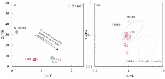 (a) Zr/Nb-La/Y diagram and (b) La/Ba-La/Nb diagram of basalts in the Nailenggeledaban area (modified after Xia et al., 2019 [62]). OIB: Ocean Island Basalt, MORB: Mid-Ocean Ridge Basalt, N-MORB: Normal Mid-Ocean Ridge Basalt.