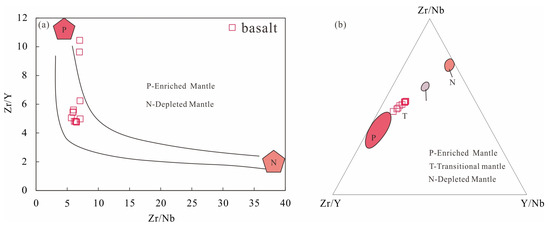 (a) Zr/Y-Zr/Nb diagram and (b) Zr/Y-Y/Nb-Zr/Nb diagram of basalts in the Naile-nggeledaban area (modified after Fodor et al., 1984 [63]).