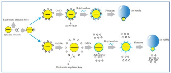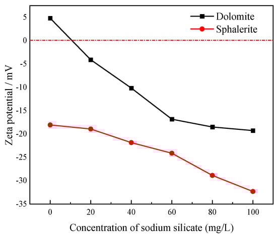 - In the absence of sodium silicate, the zeta potentials on the sphalerite and dolomite surfaces were negative and positive, respectively, resulting in heterogeneous agglomeration. In both sphalerite and dolomite treated with sodium silicate, the zeta potentials turned negative, resulting in electrostatic repulsion.