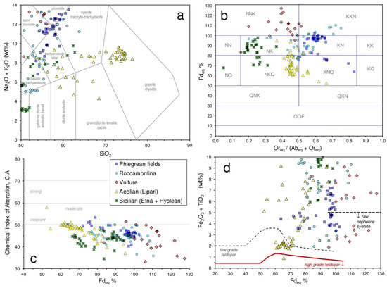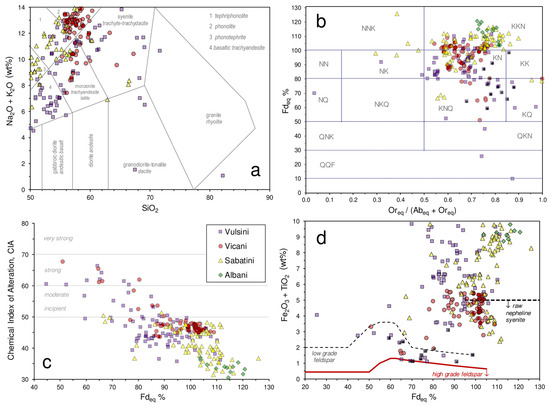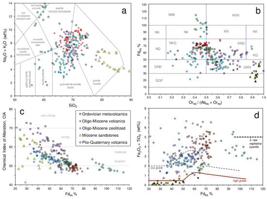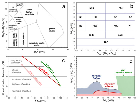 Potential of feldspathic raw materials: (a) lithological classification (intrusive/extrusive rocks) using the Total Alkali-Silica diagram [20,21]; (b) technological classification of fluxes using the alkali ratio versus equivalent feldspar amount diagram (codes, e.g., NNK, define classes of given composition and technological value; see Figure S1 for details) [11,22]; (c) degree of alteration by the Chemical Index of Alteration [23,24]; (d) prospect for exploitation by the equivalent feldspar amount versus chromophores diagram (highlighting fields of raw resources that may be successfully beneficiated to obtain different feldspathic fluxes).