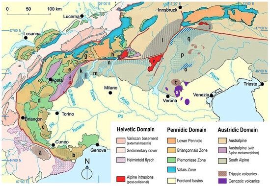 Map of the main feldspar resources in the Italian Alps and units considered in the present survey (redrawn from [28]). Helvetic Domain: (a) Argentera–Malinvern massif. Pennidic Domain: (b) Ligurian Alps, (c) Dora–Maira massif, (d) Col d’Ambin and Gran Paradiso massifs, (e) Monte Rosa massif, Ossola (g) and Valchiavenna (h) lower Pennidic nappes. Australpine Domain: (f) Sesia–Lanzo Zone, (i) Tonale–Ulten-Meran basement, (j) Pustertal–Ahrntal basement. South Alpine Domain: (k) Ivrea–Verbano Zone, (l) Serie dei Laghi, (m) Lugano volcanic platform, (n) Dervio–Olgiasca–Morbegno basement, (o) Athesian volcanic platform, (p) Valsugana Variscan granitoids and basement, (q) Periadriatic Variscan granitoids, (r) Cenozoic granitoids (Adamello, Masino-Bergell, Rieserferner, Biella, Traversella), (s) Cenozoic volcanics (Euganean–Lessini–Berici-Marosticano), (t) Triassic volcanics (Pasubio–Dolomites).