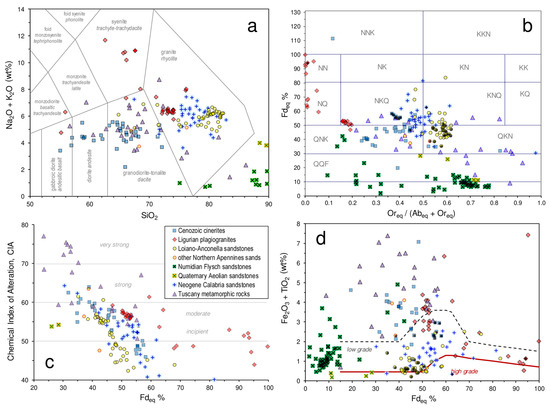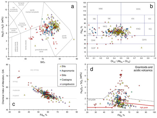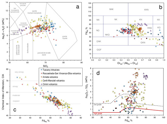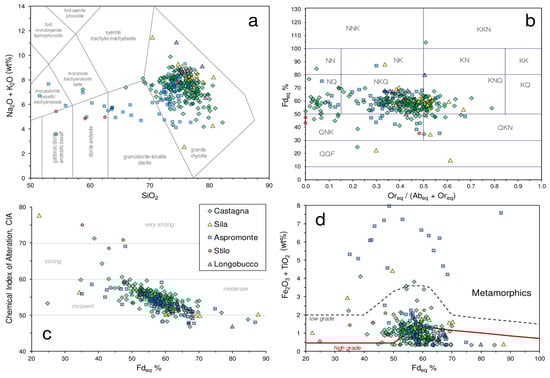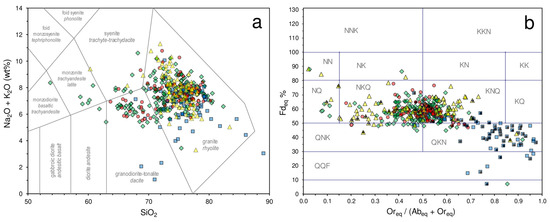 The lithological nomenclature is based on the Total Alkali-Silica (TAS) diagram for extrusive igneous rocks [20] integrated with the corresponding intrusive lithotypes, as proposed by Middlemost [21]. The TAS diagram was used also with igneous-derived metamorphics (and feldspathic sedimentary rocks) just for comparative purposes and not for classification (Figure 1a).