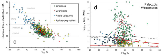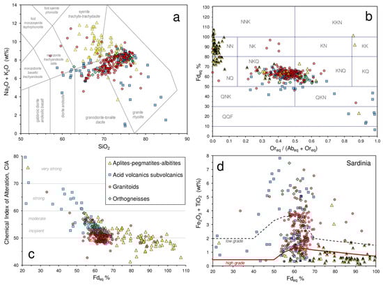 Potential of feldspathic raw materials in the Paleozoic units of Western Alps: metamorphics (gneisses) and Variscan granitoids, acidic volcanics and subvolcanics and aplite–pegmatites. Black dots are resource deposits already exploited for ceramic fluxes. (a) Classification by the TAS diagram; (b) technological classification of ceramic fluxes; (c) degree of alteration by the Chemical Index of Alteration; (d) prospect for exploitation. For the interpretation of these schemes, see explanation given in Section 2 and Figure 1 and Figure S1.