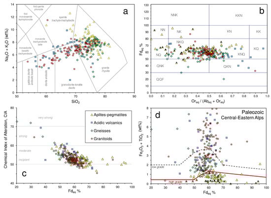 Potential of feldspathic raw materials in the Paleozoic units of the Central and Eastern Alps: Variscan granitoids, acidic volcanics, aplite–pegmatites and metamorphics (orthogneisses). Black dots are deposits already exploited for ceramic fluxes. (a) Classification by the TAS diagram; (b) technological classification of ceramic fluxes; (c) degree of alteration by the Chemical Index of Alteration; (d) prospect for exploitation. For the interpretation of these schemes, see explanation given in Section 2 and Figure 1 and Figure S1.