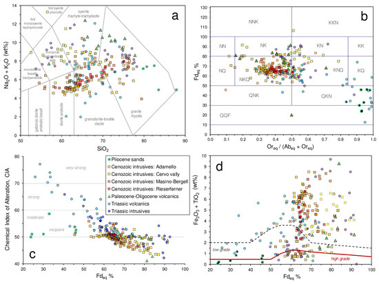 Intermediate to acidic volcanic rocks are present exclusively in the South Alpine Variscan units, mainly as so-called porphyry. Most occurrences are in the Athesian platform [33,75,76,88,104,105,106,107]; further samples come from the Lugano platform [33] and the Orobic Alps [67]. Overall, the composition of these porphyries extends over a wide range, including rhyolite, dacite, trachydacite and andesite (Figure 4a). Alteration, usually going from moderate to strong (Figure 4c), has induced a distinctive potassic character to many porphyries (Table 2), which fall mainly in the KNQ, KQ and QKN classes (Figure 4b). Nevertheless, only rhyolitic compositions have Fe2O3 and TiO2 concentrations low enough for low-grade fluxes (Figure 4d).