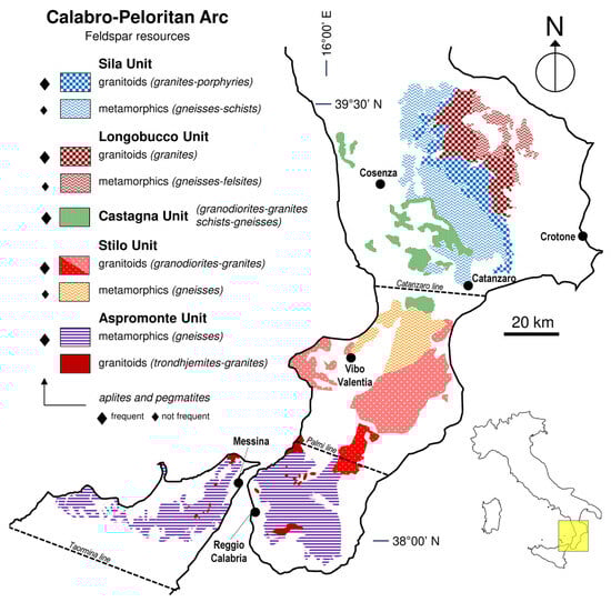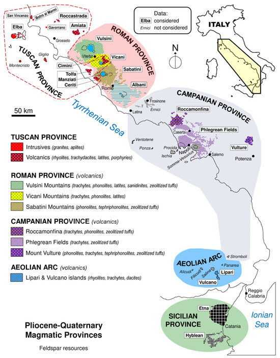 The survey conducted in the present study includes 3496 samples: 789 granitoids (65% granite, then granodiorite, tonalite and diorite); 715 acidic differentiates, in some cases metasomatized (70% pegmatite, then aplite and albitite); 702 metamorphics (64% orthogneiss and paragneiss, then various schists, metavolcanics, quartzite and epithermal alterations); 564 silica-saturated and silica-undersaturated volcanics (phonolite, trachyte, tephrite, etc.); 547 acidic volcanics and porphyries (rhyolite predominant over rhyodacite and dacite); and 179 sands and sandstones (mostly arkose). The term epithermal alteration refers to peculiar rock types utilized as ceramic flux, which are originated by low-temperature hydrothermal alteration, usually at the expense of acidic volcanics or subvolcanic bodies. Such processes can lead to extensive sericitization and/or chloritization, as in the rocks named pottery stone, eurite, pinite and agalmatolite [25,26]. These feldspar resources are distributed in four major areas (the Alps, the Apennines, the Calabro–Peloritan Arc and Sardinia) that will be considered separately.