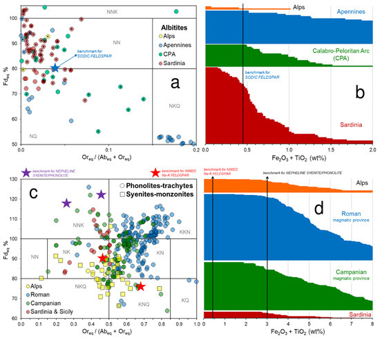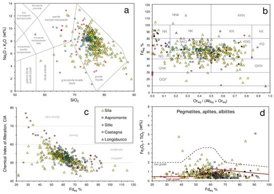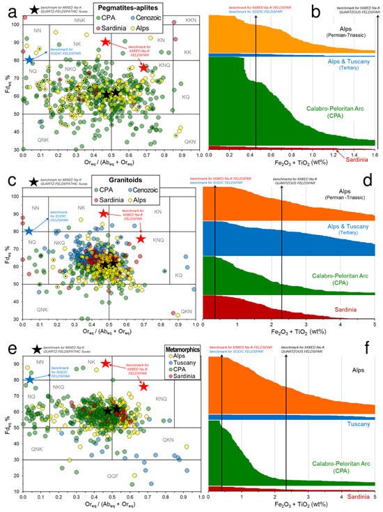 Aplites and pegmatites are well known within the South Alpine units, both in the metamorphic basement—especially in the Dervio–Olgiasca–Morbegno and Valsugana units [33,56,80,81,82,83,84,85]—and granitic intrusions of Cima d’Asta [57,86,87] and Bressanone–Ivigna–Monte Croce [88,89,90]. Albitites have been found close to Periadric intrusions at Giustino and Monte Sabion [91,92]. In the Australpine domain, pegmatites occur in the metamorphic basement, within the Tonale, Untertal, Meran–Mules and Vinschgau units [33,58,93,94,95] as well as in the Sondalo gabbro [33,96]. These differentiates typically have a granitic composition (Figure 4a) with incipient to moderate alteration (Figure 4c) and variability of the alkali ratio, which results in NQ-NKQ-KNQ classes (Figure 4b). Partially or fully albitized bodies are plotted as NN or NK fluxes. The amount of Fe2O3 and TiO2 is always low to very low, and these differentiates are candidates for high-grade feldspar (Figure 4d).