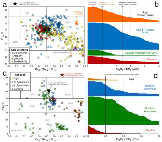 Acidic volcanics are present in the South Alpine domain, as lava flows, ignimbrites, coarse volcanic breccia and tuffs of the Serie dei Laghi unit [33,34,59,60,61,62,63,64,65]. Furthermore, in the Ligurian Alps, various porphyries and metarhyolites (locally known as porphyroids) occur [33,66,67,68]. The composition is mainly rhyolitic, with minor rhyodacite–dacite (Figure 3a). These rocks suffer from significant alteration, often strong to very strong (Figure 3c), that has brought about low equivalent feldspar contents and a marked potassium character, along with moderate amounts of chromophore oxides (Table 2). For this reason, volcanic occurrences in the Western Alps pertain to the KNQ and QKN classes, even QQF in cases of very strong alteration (Figure 3b), and present good potential for low-grade ceramic fluxes (Figure 3d).