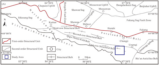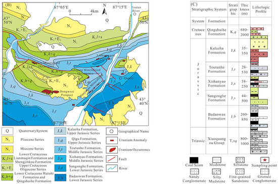 Geological map of the Liuhuanggou area. (A) Structural Division Map of the Southern Junggar Basin; (B) Geological Map of the Southern Junggar Basin; (C) Stratigraphic Column of the Jurassic Coal Measures. (modified after [17,19]).