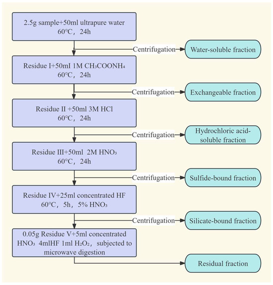 Sequential chemical extraction experiments (SCEE) were conducted to determine lithium speciation in coal-bearing claystones from the Liuhuanggou Coal Mine, following an adapted six-step procedure based on Riley et al. (Figure 2) [21]. Each step targeted operationally defined fractions: (1) Water-soluble fraction: 2.5 g of <75 μm sample was agitated with 50 mL ultrapure water at 60 °C for 24 h, centrifuged (4000 rpm, 15 min), and the supernatant collected. The residue was washed three times, the leachate diluted to 100 mL, and the solid dried at 85 °C (Residue I). (2) Ion-exchangeable fraction: Residue I was extracted with 50 mL of 1 mol/L ammonium acetate under identical conditions to yield Residue II. (3) Carbonate-bound fraction: Residue II was treated with 50 mL of 3 mol/L HCl, following the same protocol, producing Residue III. (4) Sulfide-bound fraction: Residue III was extracted using 50 mL of 2 mol/L HNO3 under consistent conditions, yielding Residue IV. (5) Silicate-bound fraction: Residue IV was digested with 25 mL concentrated HF at 60 °C for 5 h in PTFE, evaporated near-dryness at 180 °C, re-dissolved in 5% HNO3, and centrifuged to obtain Residue V. (6) Residual fraction: 0.05 g of Residue V was digested in PTFE vessels via microwave-assisted acid digestion using 5 mL concentrated HNO3, 4 mL HF, and 1 mL H2O2. After complete digestion and evaporation to dryness, the residue was diluted to 100 mL for subsequent analysis.