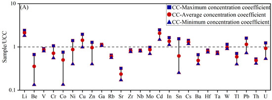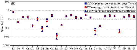 The concentration coefficient (CC) proposed by Dai et al. [23] was applied to evaluate the degree of element enrichment in claystone. CC is defined as the ratio of the trace element concentration in a sample to its corresponding background value. This coefficient was used to assess the enrichment or depletion levels of trace elements in coal-bearing samples. The classification scale for CC is as follows: CC < 0.5, depletion; 0.5 ≤ CC < 2, normal levels; 2 ≤ CC < 5, slight enrichment; 5 ≤ CC < 10, enrichment; 10 ≤ CC < 100, significant enrichment; and CC ≥ 100, abnormal enrichment. As shown in Figure 3, the enrichment pattern of trace elements in the roof and floor claystones of the Liuhuanggou Coal Mine is illustrated. Based on the CC distribution diagram (Figure 3A), Li (CC = 2.13) and Cd (CC = 2.07) were slightly enriched in the claystone roof of the Xishanyao Formation at the Liuhuanggou Coal Mine. Notably, in the floor strata, the average Li content reached 140.94 μg/g, corresponding to enrichment (CC = 7.05) (Figure 3B). In addition, Ga, Zr, Nb, In, Hf, Ta, W, Th, and U also exhibited slight enrichment.