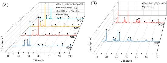 X-ray powder diffraction (XRD) pattern. (A) Samples ND1–ND4; (B) Samples ND5 and ND6.