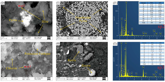 Additional identified phases included rutile, chromite, and zircon. Chromite and zircon were observed as accessory minerals scattered within the matrix as stellate grains and fine detrital clasts (Figure 5B,H). EDS analysis (Figure 5I) indicated a Si/Al atomic ratio of approximately 1.27 (typically chlorite) and a notably high Fe content (16.09 wt%), exceeding that of typical clay minerals. The low concentrations of Ca and K excluded the possibility of illite or Fe-bearing silicates, thereby identifying the mineral as Fe-rich chlorite (Figure 5G). The oolitic texture and dominance of Fe2+, coupled with undetectable Mg levels, suggested its identification as chamosite. Integrated SEM observations confirmed that the roof and floor samples ND1, ND5, and ND6 with elevated lithium contents were composed primarily of clay minerals (illite and kaolinite), along with quartz, rutile, pyrite, and minor amounts of chlorite (Figure 5).