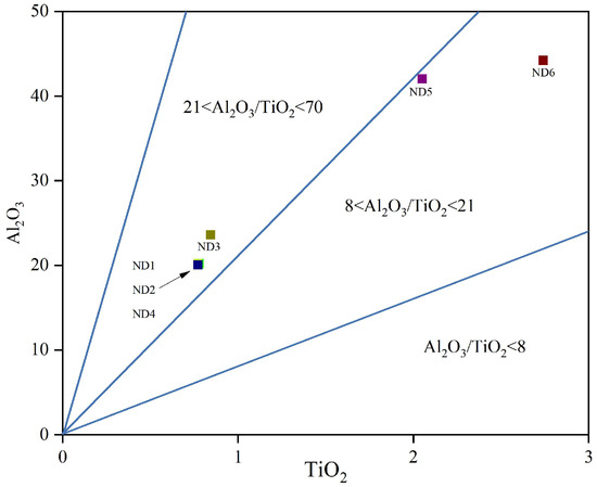 Based on their concentration in coal, elements can be classified into two categories: major elements (content > 0.01%) and trace elements (content < 0.01%) [22]. Investigating the geochemical characteristics of these major and trace elements provides critical insights into sediment provenance, reconstructs peat-forming environments, and elucidates geological evolutionary processes [10]. As revealed in Table 1, the major element oxide concentrations in the claystone from the Xishanyao Formation in the Xinjiang Liuhuanggou Coal Mine are dominated by SiO2 (64.36%), Al2O3 (28.38%), and K2O (2.16%), suggesting the probable presence of abundant aluminosilicate minerals. Other oxides were present in decreasing order of abundance as follows: Fe2O3 (1.69 wt%) > TiO2 (1.33 wt%) > Na2O (0.78 wt%) > MgO (0.75 wt%) > CaO (0.14 wt%). Notably, sample ND1 exhibited the highest SiO2 content (71.13 wt%), whereas ND6 (a floor stratum sample) recorded the highest Al2O3 concentration (44.21 wt%). As shown in Table 2, the contents of trace elements in the claystone of the Xishanyao Formation from the Liuhuanggou Coal Mine are presented. The average lithium (Li) content is 75.3 μg/g, with a maximum value of 155.9 μg/g, significantly higher than the average upper continental crust (UCC) value of 20 μg/g [11]. Additionally, several other elements, including V, Cr, Ga, Zr, Nb, Mo, Cd, In, Hf, Ta, W, Pb, Th, and U, were present in concentrations above the average UCC values (Table 2).