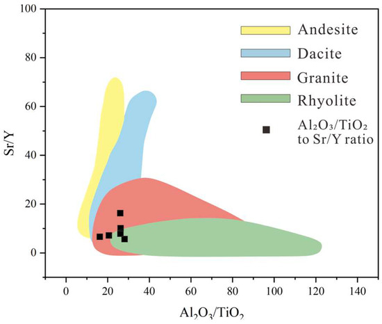 Provenance characteristics are a primary factor controlling trace element concentrations in sedimentary rocks [25]. During weathering, transport, and deposition, elements such as Al, Ti, Zr, Nb, and Hf exhibit low mobility, making them reliable indicators for inferring source rock composition. Two principal methods are commonly employed for provenance discrimination: Sahraeyan and Bahrami [26] proposed a discriminant function diagram based on major elements to classify four source rock types—mafic (P1), intermediate (P2), felsic (P3), and quartzose recycled (P4) [27]; while Dai et al. introduced the Al2O3/TiO2 ratio as a geochemical indicator, with value ranges of 3–8, 8–21, and 21–70 corresponding to sediments derived from mafic, intermediate, and felsic igneous rocks, respectively [28]. As shown in Figure 8, the Al2O3/TiO2 ratios in claystones from the Xishanyao Formation at the Liuhuanggou Coal Mine ranged from 16.14 to 28.01, with an average of 23.79. These values indicate that the source rocks were predominantly intermediate to felsic in composition. Notably, samples with higher lithium concentrations fell within the range characteristic of intermediate rocks, suggesting a potential link to weathering of such lithologies. To further constrain the provenance, an Al2O3/TiO2 vs. Sr/Y plot was used (Figure 9), which also indicated a dominant granitic or rhyolitic (felsic) source.