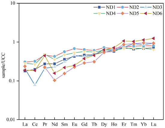 Rare earth elements (REEs) have short residence times in seawater. They are rapidly incorporated into detrital minerals and suspended particulate matter without significant fractionation, thus effectively preserving the geochemical signature of their source regions. This property makes REEs particularly valuable for sediment provenance studies [30]. Therefore, REE characteristics are widely used in provenance analysis. In this study, REE data from the claystone samples were normalized to UCC values using a standard UCC normalization scheme (Figure 10) [11,19]. The overall REE distribution patterns were similar across samples, exhibiting a left-skewed trend indicative of heavy rare earth element (HREE) enrichment. In samples ND1–ND4, light rare earth elements (LREEs) showed mild depletion, whereas HREEs were relatively flat to slightly enriched. In contrast, samples ND5 and ND6 exhibited LREE depletion and more pronounced HREE enrichment. Europium (Eu) typically exhibits negative anomalies in coal-bearing rocks derived from acidic to intermediate-acidic terrestrial sources. However, positive Eu anomalies may occur under the influence of high-temperature hydrothermal fluids or reducing environments [31]. In this study, the average δEu value was 0.76 (δEu = EuN/EuN* = EuN/(0.67 × SmN + 0.33 × TbN; N, Standardization [32]), indicating a negative Eu anomaly. This suggests that the claystone was primarily influenced by terrestrial clastic input, likely derived from weathered intermediate–felsic rocks. Additionally, Vos et al. [33] demonstrated that quartz formed in high-energy eolian sands exhibits improved roundness with increasing transport distance. As shown in Figure 5B, the presence of well-rounded quartz grains suggests a relatively long distance from the sediment source area.