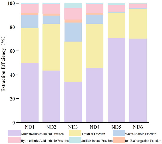 Sequential chemical extraction results (Table 3) indicated a pronounced inorganic affinity for lithium in claystone samples ND1–ND6. The aluminosilicate-bound fraction was dominant, ranging from 34.35% to 70.77% (average: 52.37%), with the highest proportions observed in floor strata samples ND5 and ND6. Despite minor variations among samples, this form consistently represents the principal mode of Li occurrence. The organic-bound fraction was the secondary form, accounting for 21.22% to 39.17% (average: 30.86%), with elevated values in roof samples ND2 and ND4. This distribution pattern implies that organic matter may contribute to lithium enrichment via complexation mechanisms. The HCl-soluble and water-soluble fractions were comparatively minor, averaging 7.17% and 7.05%, respectively. Ion-exchangeable and sulfide-bound forms were present only in trace amounts, with averages of 1.36% and 1.19%, respectively. Notably, in the high-lithium samples ND5 and ND6, water-soluble and ion-exchangeable lithium together accounted for less than 1%, highlighting the dominance of more stable binding states.