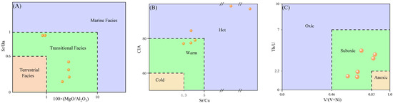 Paleoenvironmental proxies. (modified after [38]). (A) Paleosalinity indicators. (B) Paleoclimate indicators. (C) Paleoredox indicators.