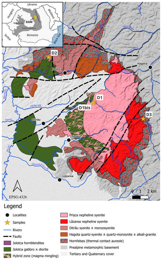 - Pál-Molnár, E.; Kiri, L.; Lukács, R.; Dunkl, I.; Batki, A.; Szemerédi, M.; Almási, E.E.; Sogrik, E.; Harangi, S. Timing of magmatism of the Ditrău Alkaline Massif, Romania—A review based on new U–Pb and K/Ar data. Cent. Eur. Geol. 2021, 64, 18–37. [Google Scholar] [CrossRef]