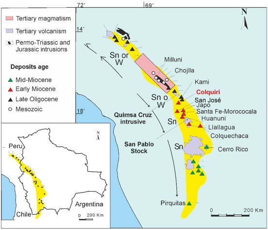 Location of Colquiri in the Central Andean tin belt. Data modified from [36].