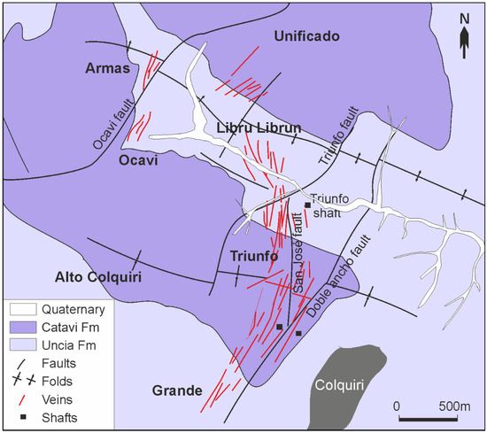 The deposit consists of veins hosted within Silurian shales and quartzites of the Uncía and Catavi Formations (Figure 2). The Uncía Formation is composed primarily of pelitic rocks with sandy intercalations toward its upper levels, while the Catavi Formation comprises alternating layers of quartzites and black shales, with a total thickness of approximately 500 m. All these rock units have been affected by folding with a NW–SE structural trend. The mineralized veins are found filling faults with N–S and NNE orientations, with the main fault systems being San José, Ocavi, Triunfo, and Doble Ancho. These veins can reach lengths of up to 700 m and thicknesses of up to 2 m. The most significant veins are Blanca, Rosario, San Antonio, and San Carlos. According to the distribution of veins, the deposit has been divided into seven sectors [33]: Armas, Ocavi, Unificada, Triunfo, Grande, Alto Colquiri, and Central.