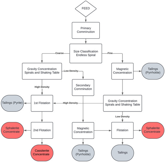 Currently, only about 50 wt.% of cassiterite is recovered, which is an even lower amount than the ratio of liberated cassiterite. The grain size of cassiterite is much finer than the particle size in which it is found, which explains the high percentage of unrecovered ore. In contrast, the size of sphalerite is similar to that of the particles, explaining why the percentage of concentrated sphalerite is much higher than that of cassiterite. Difficulties in separating cassiterite using gravitational separation are common in processing plants, as it is difficult to recover when it is very small, and even with flotation, recovery does not usually exceed 80% [60].